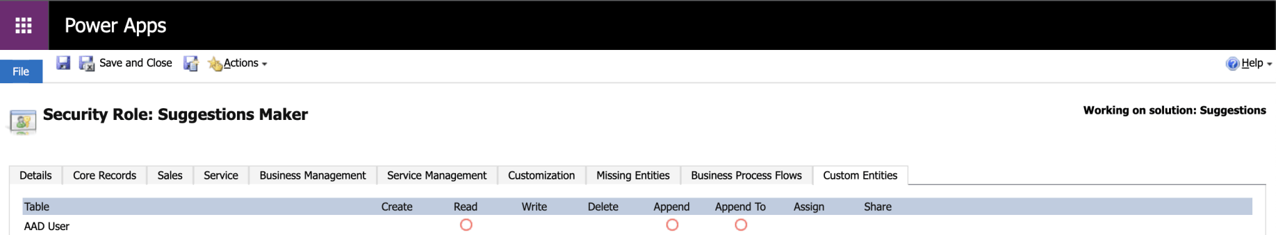 The half yellow circle shows that the permissions apply to the business unit.Suggestion table permissions (Business Unit)